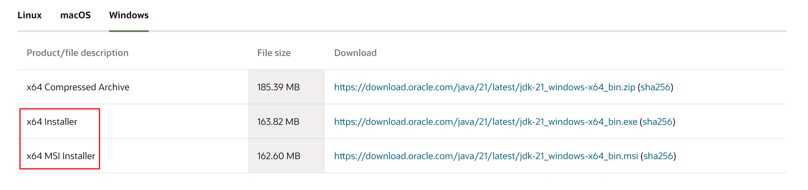 - 以 Windows 操作系统为例,建议您下载 x64 Installer 或 x64 MSI Installer 安装文件
