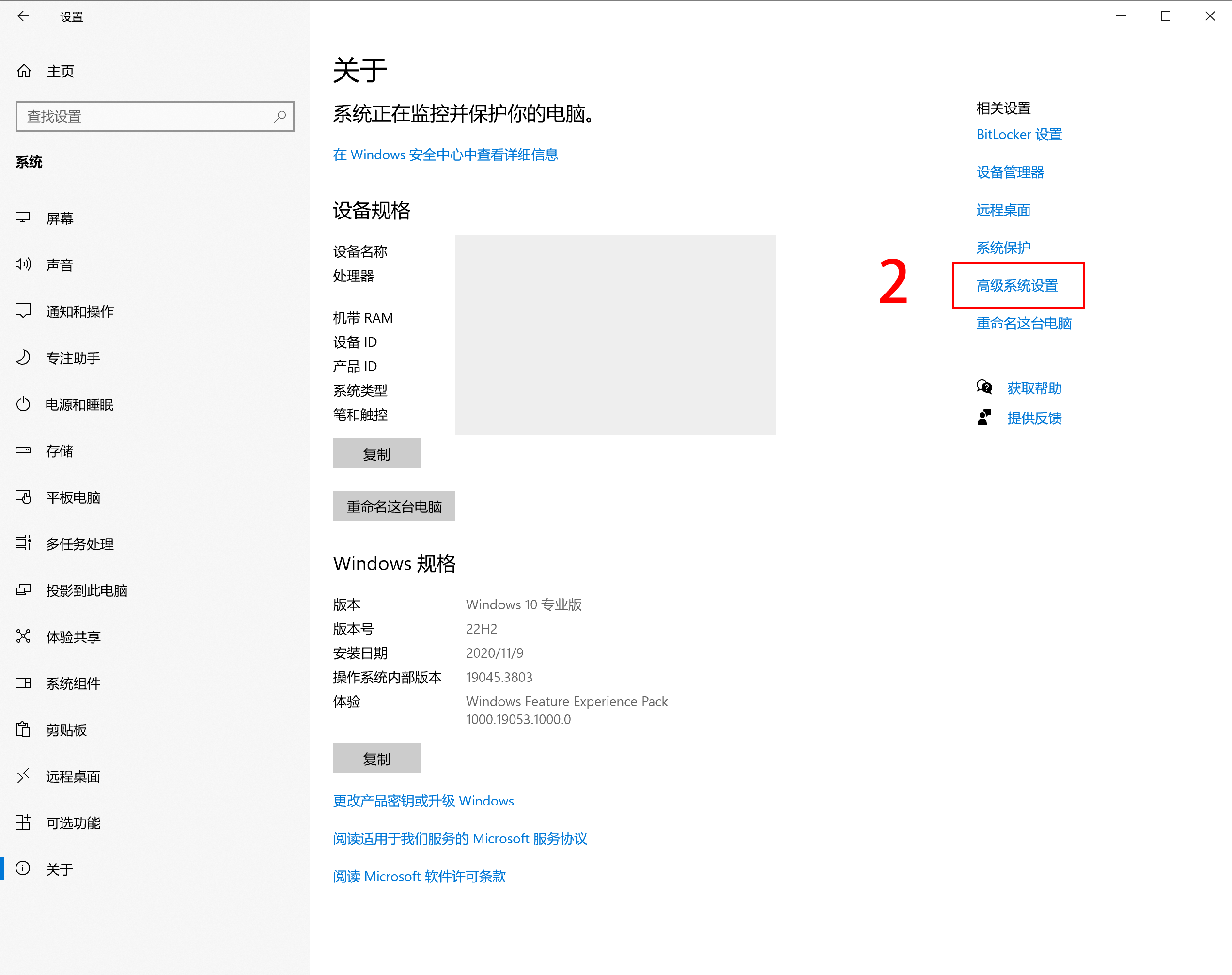 - 点击“关于”,点击“高级系统设置”,打开“系统属性”