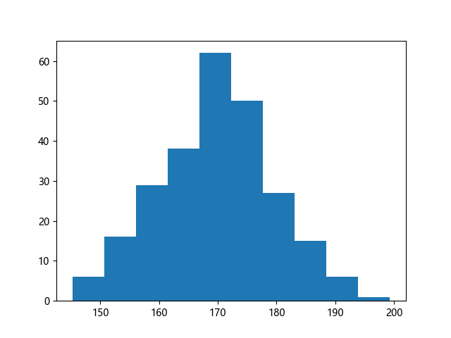 # 以下三行代码使编译器支持绘图功能: import sys import matplotlib matplotlib.use('Agg') import matplotlib.pyplot as plt import numpy as np # 生成正态分布数据: x = np.random.normal(170, 10, 250) # 均值 170,标准差 10,250 个数据点 # 绘制直方图: plt.hist(x) # 创建直方图 plt.show() # 显示图表 # 以下两行代码使编译器能够输出图形: plt.savefig(sys.stdout.buffer) sys.stdout.flush()