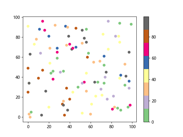 # 这三行代码使编译器能够绘图: import sys import matplotlib matplotlib.use('Agg') import matplotlib.pyplot as plt import numpy as np x = np.random.randint(100, size=(100)) y = np.random.randint(100, size=(100)) colors = np.random.randint(100, size=(100)) # 使用强调色系绘制散点图: plt.scatter(x, y, c=colors, cmap='Accent') plt.colorbar() plt.show() # 这两行代码使编译器能够输出图形: plt.savefig(sys.stdout.buffer) sys.stdout.flush()