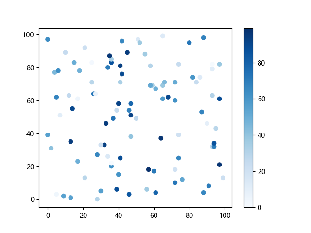 # 这三行代码使编译器能够绘图: import sys import matplotlib matplotlib.use('Agg') import matplotlib.pyplot as plt import numpy as np x = np.random.randint(100, size=(100)) y = np.random.randint(100, size=(100)) colors = np.random.randint(100, size=(100)) # 使用蓝色渐变绘制散点图: plt.scatter(x, y, c=colors, cmap='Blues') plt.colorbar() # 显示颜色条 plt.show() # 显示图形 # 这两行代码使编译器能够输出图形: plt.savefig(sys.stdout.buffer) sys.stdout.flush()