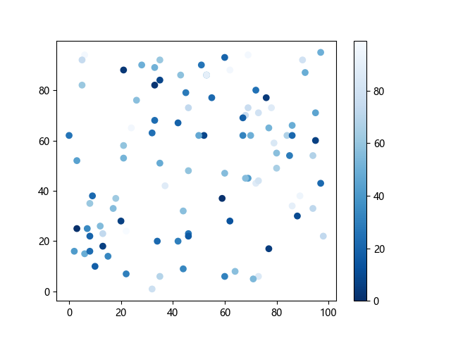 # 这三行代码使编译器能够绘图: import sys import matplotlib matplotlib.use('Agg') import matplotlib.pyplot as plt import numpy as np x = np.random.randint(100, size=(100)) y = np.random.randint(100, size=(100)) colors = np.random.randint(100, size=(100)) # 使用反向蓝色渐变绘制散点图: plt.scatter(x, y, c=colors, cmap='Blues_r') plt.colorbar() # 显示颜色条 plt.show() # 显示图形 # 这两行代码使编译器能够输出图形: plt.savefig(sys.stdout.buffer) sys.stdout.flush()