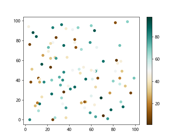 # 这三行代码使编译器能够绘图: import sys import matplotlib matplotlib.use('Agg') import matplotlib.pyplot as plt import numpy as np x = np.random.randint(100, size=(100)) y = np.random.randint(100, size=(100)) colors = np.random.randint(100, size=(100)) # 使用棕蓝绿渐变绘制散点图: plt.scatter(x, y, c=colors, cmap='BrBG') plt.colorbar() # 显示颜色条 plt.show() # 显示图形 # 这两行代码使编译器能够输出图形: plt.savefig(sys.stdout.buffer) sys.stdout.flush()