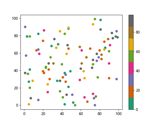 # 这三行代码使编译器能够绘图: import sys import matplotlib matplotlib.use('Agg') import matplotlib.pyplot as plt import numpy as np x = np.random.randint(100, size=(100)) y = np.random.randint(100, size=(100)) colors = np.random.randint(100, size=(100)) # 使用 Dark2 配色方案绘制散点图: plt.scatter(x, y, c=colors, cmap='Dark2') plt.colorbar() plt.show() # 这两行代码使编译器能够输出图形: plt.savefig(sys.stdout.buffer) sys.stdout.flush()