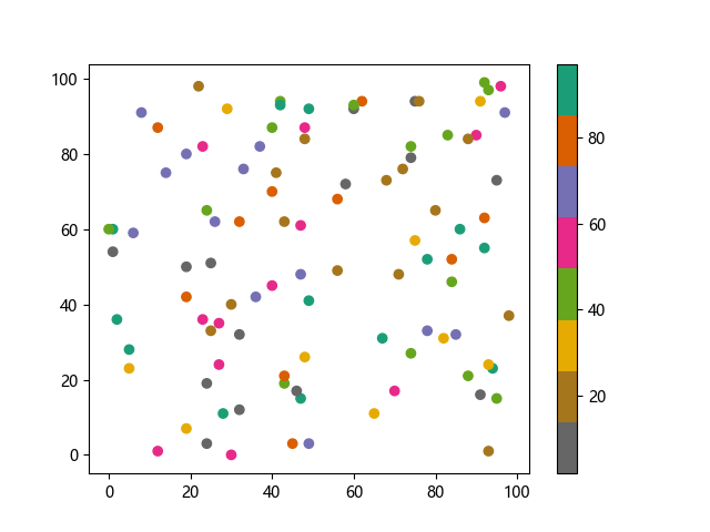 # 这三行代码使编译器能够绘图: import sys import matplotlib matplotlib.use('Agg') import matplotlib.pyplot as plt import numpy as np x = np.random.randint(100, size=(100)) y = np.random.randint(100, size=(100)) colors = np.random.randint(100, size=(100)) # 使用反向 Dark2 配色方案绘制散点图: plt.scatter(x, y, c=colors, cmap='Dark2_r') plt.colorbar() plt.show() # 这两行代码使编译器能够输出图形: plt.savefig(sys.stdout.buffer) sys.stdout.flush()