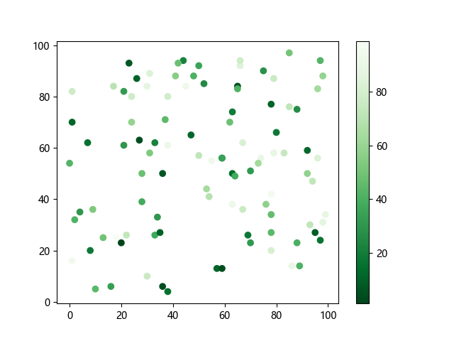 # 这三行代码使编译器能够绘图: import sys import matplotlib matplotlib.use('Agg') import matplotlib.pyplot as plt import numpy as np x = np.random.randint(100, size=(100)) y = np.random.randint(100, size=(100)) colors = np.random.randint(100, size=(100)) # 使用反向绿色渐变绘制散点图: plt.scatter(x, y, c=colors, cmap='Greens_r') plt.colorbar() plt.show() # 这两行代码使编译器能够输出图形: plt.savefig(sys.stdout.buffer) sys.stdout.flush()