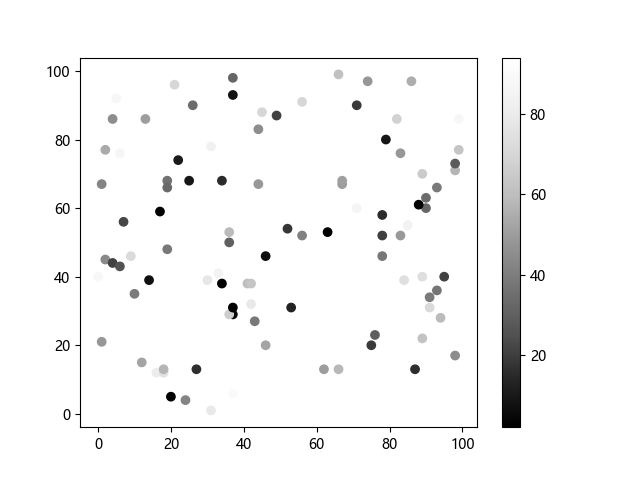 # 这三行代码使编译器能够绘图: import sys import matplotlib matplotlib.use('Agg') import matplotlib.pyplot as plt import numpy as np x = np.random.randint(100, size=(100)) y = np.random.randint(100, size=(100)) colors = np.random.randint(100, size=(100)) # 使用反向灰度渐变绘制散点图: plt.scatter(x, y, c=colors, cmap='Greys_r') plt.colorbar() plt.show() # 这两行代码使编译器能够输出图形: plt.savefig(sys.stdout.buffer) sys.stdout.flush()