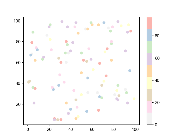 # 这三行代码使编译器能够绘图: import sys import matplotlib matplotlib.use('Agg') import matplotlib.pyplot as plt import numpy as np x = np.random.randint(100, size=(100)) y = np.random.randint(100, size=(100)) colors = np.random.randint(100, size=(100)) # 绘制反向 Pastel1 配色方案的散点图: plt.scatter(x, y, c=colors, cmap='Pastel1_r') plt.colorbar() plt.show() # 这两行代码使编译器能够输出图形: plt.savefig(sys.stdout.buffer) sys.stdout.flush()