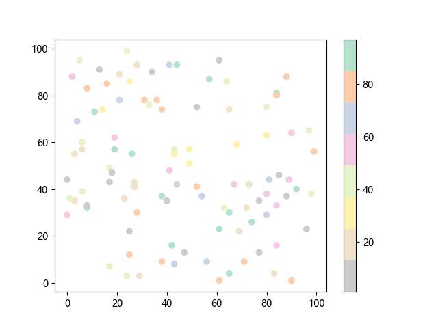 # 这三行代码使编译器能够绘图: import sys import matplotlib matplotlib.use('Agg') import matplotlib.pyplot as plt import numpy as np # 生成 100 个随机 x 坐标: x = np.random.randint(100, size=(100)) # 生成 100 个随机 y 坐标: y = np.random.randint(100, size=(100)) # 生成 100 个随机颜色值: colors = np.random.randint(100, size=(100)) # 绘制彩色散点图 plt.scatter(x, y, c=colors, cmap='Pastel2_r') plt.colorbar() # 显示颜色条 plt.show() # 显示图形 # 这两行代码使编译器能够输出图形: plt.savefig(sys.stdout.buffer) sys.stdout.flush()