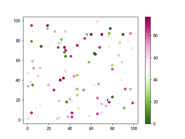 # 这三行代码使编译器能够绘图: import sys import matplotlib matplotlib.use('Agg') import matplotlib.pyplot as plt import numpy as np # 生成随机数据: x = np.random.randint(100, size=(100)) y = np.random.randint(100, size=(100)) colors = np.random.randint(100, size=(100)) # 使用 PiYG_r 配色方案绘制粉绿反向渐变色散点图: plt.scatter(x, y, c=colors, cmap='PiYG_r') plt.colorbar() # 显示颜色条 plt.show() # 显示图形 # 这两行代码使编译器能够输出图形: plt.savefig(sys.stdout.buffer) sys.stdout.flush()