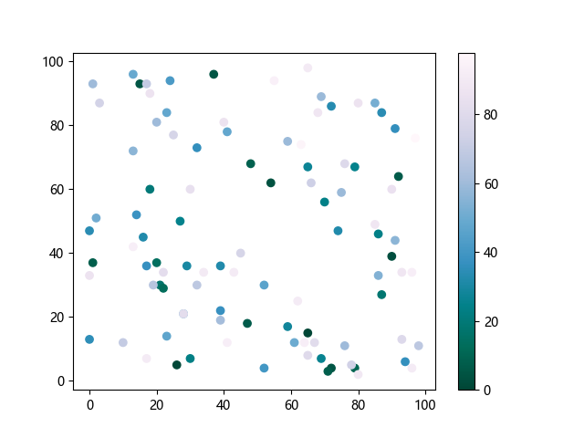 # 这三行代码使编译器能够绘图: import sys import matplotlib matplotlib.use('Agg') import matplotlib.pyplot as plt import numpy as np # 生成随机数据: x = np.random.randint(100, size=(100)) y = np.random.randint(100, size=(100)) colors = np.random.randint(100, size=(100)) # 使用 PuBuGn_r 配色方案绘制紫蓝绿反向渐变色散点图: plt.scatter(x, y, c=colors, cmap='PuBuGn_r') plt.colorbar() # 显示颜色条 plt.show() # 显示图形 # 这两行代码使编译器能够输出图形: plt.savefig(sys.stdout.buffer) sys.stdout.flush()