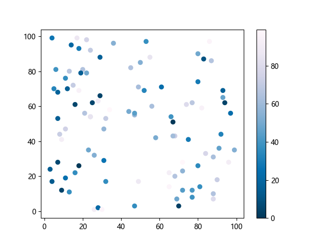 # 这三行代码使编译器能够绘图: import sys import matplotlib matplotlib.use('Agg') import matplotlib.pyplot as plt import numpy as np # 生成随机数据: x = np.random.randint(100, size=(100)) y = np.random.randint(100, size=(100)) colors = np.random.randint(100, size=(100)) # 使用 PuBu_r 配色方案绘制紫蓝色反向渐变色散点图: plt.scatter(x, y, c=colors, cmap='PuBu_r') plt.colorbar() # 显示颜色条 plt.show() # 显示图形 # 这两行代码使编译器能够输出图形: plt.savefig(sys.stdout.buffer) sys.stdout.flush()