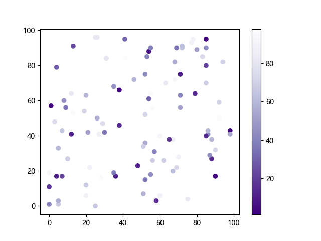 # 这三行代码使编译器能够绘图: import sys import matplotlib matplotlib.use('Agg') import matplotlib.pyplot as plt import numpy as np # 生成随机数据: x = np.random.randint(100, size=(100)) y = np.random.randint(100, size=(100)) colors = np.random.randint(100, size=(100)) # 使用 Purples_r 配色方案绘制紫色反向渐变色散点图: plt.scatter(x, y, c=colors, cmap='Purples_r') plt.colorbar() # 显示颜色条 plt.show() # 显示图形 # 这两行代码使编译器能够输出图形: plt.savefig(sys.stdout.buffer) sys.stdout.flush()