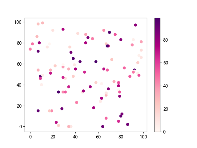 # 这三行代码使编译器能够绘图: import sys import matplotlib matplotlib.use('Agg') import matplotlib.pyplot as plt import numpy as np # 生成随机数据 x = np.random.randint(100, size=(100)) y = np.random.randint(100, size=(100)) colors = np.random.randint(100, size=(100)) # 使用 RdPu 配色方案绘制红紫色渐变色散点图: plt.scatter(x, y, c=colors, cmap='RdPu') plt.colorbar() # 显示颜色条 plt.show() # 显示图形 # 这两行代码使编译器能够输出图形: plt.savefig(sys.stdout.buffer) sys.stdout.flush()