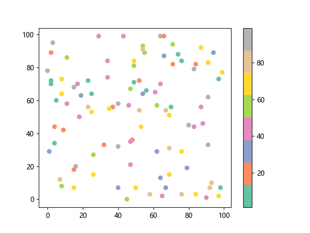 # 这三行代码使编译器能够绘图: import sys import matplotlib matplotlib.use('Agg') import matplotlib.pyplot as plt import numpy as np # 生成随机数据: x = np.random.randint(100, size=(100)) y = np.random.randint(100, size=(100)) colors = np.random.randint(100, size=(100)) # 使用 Set2 (8 色调色板)配色方案绘制 Set2 离散色散点图: plt.scatter(x, y, c=colors, cmap='Set2') plt.colorbar() # 显示颜色条 plt.show() # 显示图形 # 这两行代码使编译器能够输出图形: plt.savefig(sys.stdout.buffer) sys.stdout.flush()