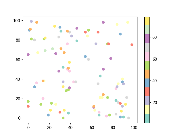 # 这三行代码使编译器能够绘图: import sys import matplotlib matplotlib.use('Agg') import matplotlib.pyplot as plt import numpy as np # 生成随机数据: x = np.random.randint(100, size=(100)) y = np.random.randint(100, size=(100)) colors = np.random.randint(100, size=(100)) # 使用 Set3 (12 色调色板)配色方案绘制 Set3 离散色散点图: plt.scatter(x, y, c=colors, cmap='Set3') plt.colorbar() # 显示颜色条 plt.show() # 显示图形 # 这两行代码使编译器能够输出图形: plt.savefig(sys.stdout.buffer) sys.stdout.flush()