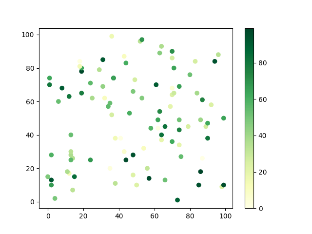 # 这三行代码使编译器能够绘图: import sys import matplotlib matplotlib.use('Agg') import matplotlib.pyplot as plt import numpy as np # 生成随机数据: x = np.random.randint(100, size=(100)) y = np.random.randint(100, size=(100)) colors = np.random.randint(100, size=(100)) # 使用 YlGn (黄-绿渐变)配色方案绘制散点图: plt.scatter(x, y, c=colors, cmap='YlGn') plt.colorbar() # 显示颜色条 plt.show() # 显示图形 # 这两行代码使编译器能够输出图形: plt.savefig(sys.stdout.buffer) sys.stdout.flush()