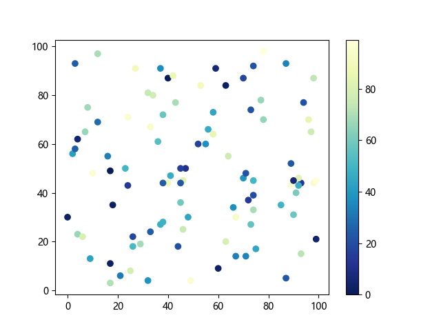 # 这三行代码使编译器能够绘图: import sys import matplotlib matplotlib.use('Agg') import matplotlib.pyplot as plt import numpy as np # 生成随机数据点: x = np.random.randint(100, size=(100)) y = np.random.randint(100, size=(100)) colors = np.random.randint(100, size=(100)) # 使用 YlGnBu_r (黄-绿-蓝反向渐变)配色方案绘制散点图: plt.scatter(x, y, c=colors, cmap='YlGnBu_r') plt.colorbar() # 显示颜色条 plt.show() # 显示图形 # 这两行代码使编译器能够输出图形: plt.savefig(sys.stdout.buffer) sys.stdout.flush()