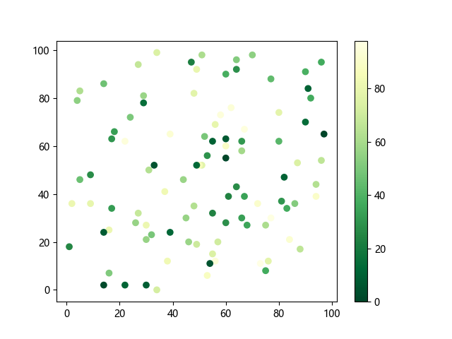 # 这三行代码使编译器能够绘图: import sys import matplotlib matplotlib.use('Agg') import matplotlib.pyplot as plt import numpy as np # 生成随机数据: x = np.random.randint(100, size=(100)) y = np.random.randint(100, size=(100)) colors = np.random.randint(100, size=(100)) # 使用YlGn_r(黄-绿反向渐变)配色方案绘制散点图: plt.scatter(x, y, c=colors, cmap='YlGn_r') plt.colorbar() # 显示颜色条 plt.show() # 显示图形 # 这两行代码使编译器能够输出图形: plt.savefig(sys.stdout.buffer) sys.stdout.flush()