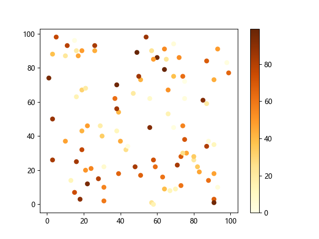 # 这三行代码使编译器能够绘图: import sys import matplotlib matplotlib.use('Agg') import matplotlib.pyplot as plt import numpy as np # 生成随机数据: x = np.random.randint(100, size=(100)) y = np.random.randint(100, size=(100)) colors = np.random.randint(100, size=(100)) # 使用 YlOrBr (黄-橙-棕渐变)配色方案绘制黄橙棕渐变散点图: plt.scatter(x, y, c=colors, cmap='YlOrBr') plt.colorbar() # 显示颜色条 plt.show() # 显示图形 # 这两行代码使编译器能够输出图形: plt.savefig(sys.stdout.buffer) sys.stdout.flush()