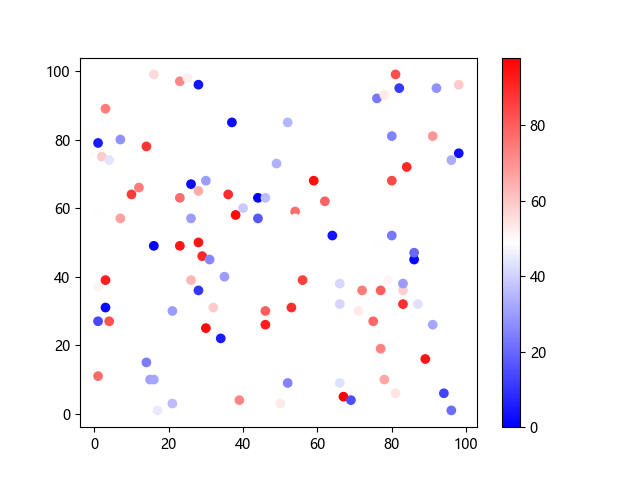 # 这三行代码使编译器能够绘图: import sys import matplotlib matplotlib.use('Agg') import matplotlib.pyplot as plt import numpy as np # 生成随机数据 x = np.random.randint(100, size=(100)) y = np.random.randint(100, size=(100)) colors = np.random.randint(100, size=(100)) # 使用 bwr 配色方案绘制蓝白红渐变色散点图: plt.scatter(x, y, c=colors, cmap='bwr') plt.colorbar() plt.show() # 这两行代码使编译器能够输出图形: plt.savefig(sys.stdout.buffer) sys.stdout.flush()