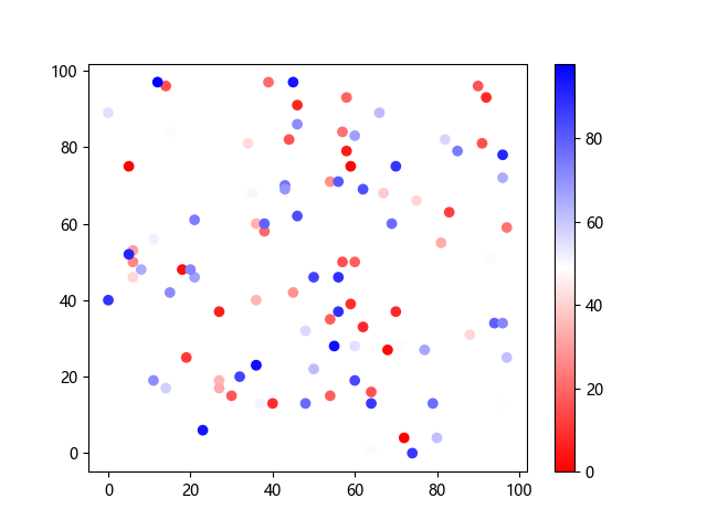 # 这三行代码使编译器能够绘图: import sys import matplotlib matplotlib.use('Agg') import matplotlib.pyplot as plt import numpy as np # 生成随机数据点 x = np.random.randint(100, size=(100)) y = np.random.randint(100, size=(100)) colors = np.random.randint(100, size=(100)) # 使用 bwr_r 配色方案绘制蓝白红反向渐变色散点图: plt.scatter(x, y, c=colors, cmap='bwr_r') plt.colorbar() plt.show() # 这两行代码使编译器能够输出图形: plt.savefig(sys.stdout.buffer) sys.stdout.flush()