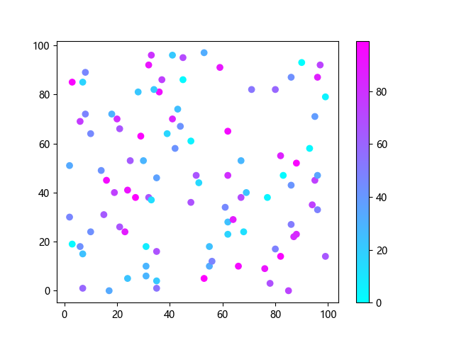# 这三行代码使编译器能够绘图: import sys import matplotlib matplotlib.use('Agg') import matplotlib.pyplot as plt import numpy as np # 生成随机数据 x = np.random.randint(100, size=(100)) y = np.random.randint(100, size=(100)) colors = np.random.randint(100, size=(100)) # 使用 cool 配色方案绘制冷色调渐变色散点图: plt.scatter(x, y, c=colors, cmap='cool') plt.colorbar() plt.show() # 这两行代码使编译器能够输出图形: plt.savefig(sys.stdout.buffer) sys.stdout.flush()