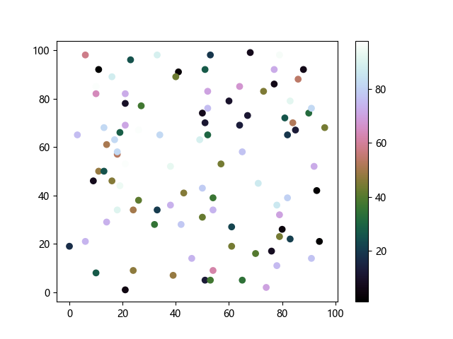 # 这三行代码使编译器能够绘图: import sys import matplotlib matplotlib.use('Agg') import matplotlib.pyplot as plt import numpy as np # 生成随机数据 x = np.random.randint(100, size=(100)) y = np.random.randint(100, size=(100)) colors = np.random.randint(100, size=(100)) # 使用 cubehelix 配色方案绘制螺旋立方体渐变色散点图: plt.scatter(x, y, c=colors, cmap='cubehelix') plt.colorbar() plt.show() # 这两行代码使编译器能够输出图形: plt.savefig(sys.stdout.buffer) sys.stdout.flush()