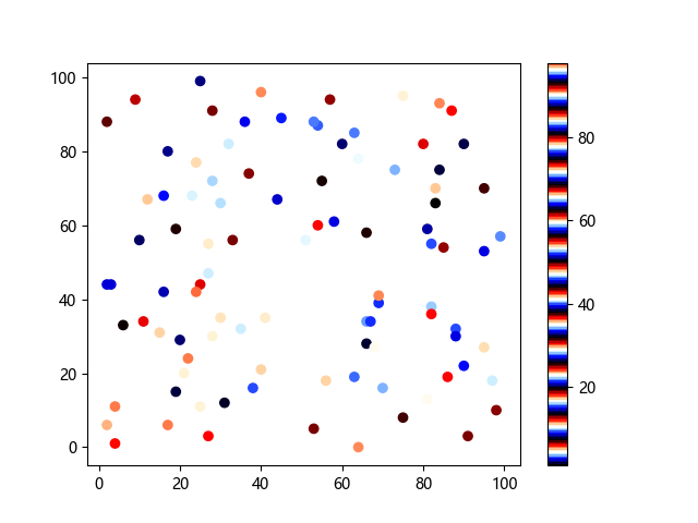 # 这三行代码使编译器能够绘图: import sys import matplotlib matplotlib.use('Agg') import matplotlib.pyplot as plt import numpy as np # 生成随机数据点 x = np.random.randint(100, size=(100)) y = np.random.randint(100, size=(100)) colors = np.random.randint(100, size=(100)) # 使用 flag_r 配色方案绘制旗帜反向渐变色散点图: plt.scatter(x, y, c=colors, cmap='flag_r') plt.colorbar() plt.show() # 这两行代码使编译器能够输出图形: plt.savefig(sys.stdout.buffer) sys.stdout.flush()