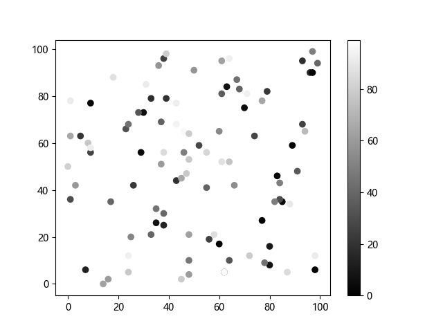 # 这三行代码使编译器能够绘图: import sys import matplotlib matplotlib.use('Agg') import matplotlib.pyplot as plt import numpy as np # 生成随机数据 x = np.random.randint(100, size=(100)) y = np.random.randint(100, size=(100)) colors = np.random.randint(100, size=(100)) # 使用 gist_gray 配色方案绘制灰度渐变色散点图: plt.scatter(x, y, c=colors, cmap='gist_gray') plt.colorbar() plt.show() # 这两行代码使编译器能够输出图形: plt.savefig(sys.stdout.buffer) sys.stdout.flush()
