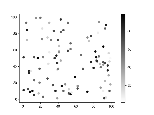 # 这三行代码使编译器能够绘图: import sys import matplotlib matplotlib.use('Agg') import matplotlib.pyplot as plt import numpy as np # 生成随机数据点 x = np.random.randint(100, size=(100)) y = np.random.randint(100, size=(100)) colors = np.random.randint(100, size=(100)) # 使用 gist_gray_r 配色方案绘制灰度反向渐变色散点图: plt.scatter(x, y, c=colors, cmap='gist_gray_r') plt.colorbar() plt.show() # 这两行代码使编译器能够输出图形: plt.savefig(sys.stdout.buffer) sys.stdout.flush()