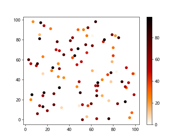 # 这三行代码使编译器能够绘图: import sys import matplotlib matplotlib.use('Agg') import matplotlib.pyplot as plt import numpy as np # 生成随机数据点 x = np.random.randint(100, size=(100)) y = np.random.randint(100, size=(100)) colors = np.random.randint(100, size=(100)) # 使用 gist_heat_r 配色方案绘制热力图反向渐变色散点图: plt.scatter(x, y, c=colors, cmap='gist_heat_r') plt.colorbar() plt.show() # 这两行代码使编译器能够输出图形: plt.savefig(sys.stdout.buffer) sys.stdout.flush()
