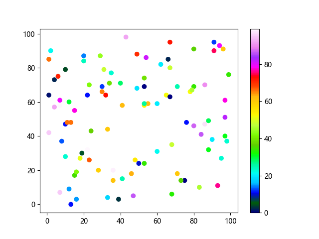 # 这三行代码使编译器能够绘图: import sys import matplotlib matplotlib.use('Agg') import matplotlib.pyplot as plt import numpy as np # 生成随机数据 x = np.random.randint(100, size=(100)) y = np.random.randint(100, size=(100)) colors = np.random.randint(100, size=(100)) # 使用 gist_ncar 配色方案绘制NCAR渐变色散点图: plt.scatter(x, y, c=colors, cmap='gist_ncar') plt.colorbar() plt.show() # 这两行代码使编译器能够输出图形: plt.savefig(sys.stdout.buffer) sys.stdout.flush()