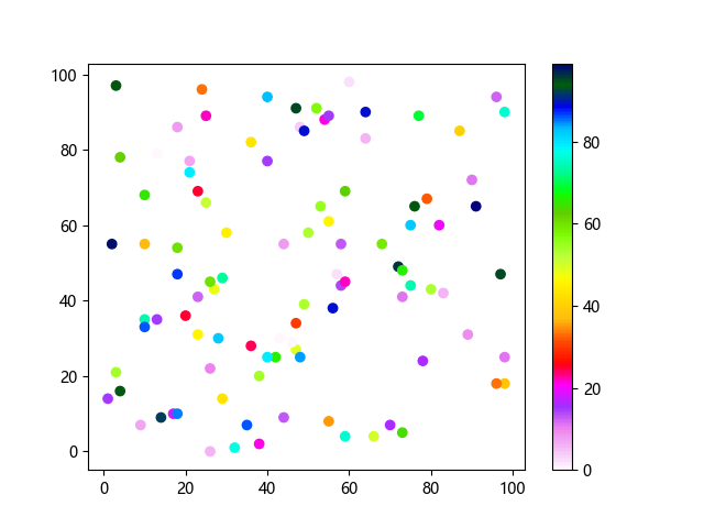 # 这三行代码使编译器能够绘图: import sys import matplotlib matplotlib.use('Agg') import matplotlib.pyplot as plt import numpy as np # 生成随机数据点 x = np.random.randint(100, size=(100)) y = np.random.randint(100, size=(100)) colors = np.random.randint(100, size=(100)) # 使用 gist_ncar_r 配色方案绘制 NCAR 反向渐变色散点图: plt.scatter(x, y, c=colors, cmap='gist_ncar_r') plt.colorbar() plt.show() # 这两行代码使编译器能够输出图形: plt.savefig(sys.stdout.buffer) sys.stdout.flush()