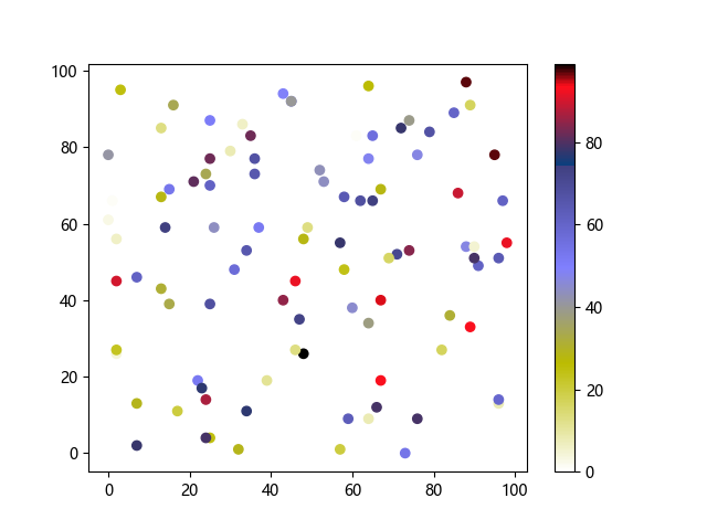 # 这三行代码使编译器能够绘图: import sys import matplotlib matplotlib.use('Agg') import matplotlib.pyplot as plt import numpy as np # 生成随机数据点 x = np.random.randint(100, size=(100)) y = np.random.randint(100, size=(100)) colors = np.random.randint(100, size=(100)) # 使用 gist_stern_r 配色方案绘制星云反向渐变色散点图: plt.scatter(x, y, c=colors, cmap='gist_stern_r') plt.colorbar() plt.show() # 这两行代码使编译器能够输出图形: plt.savefig(sys.stdout.buffer) sys.stdout.flush()