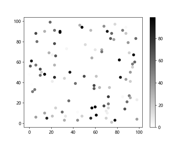# 这三行代码使编译器能够绘图: import sys import matplotlib matplotlib.use('Agg') import matplotlib.pyplot as plt import numpy as np # 生成随机数据 x = np.random.randint(100, size=(100)) y = np.random.randint(100, size=(100)) colors = np.random.randint(100, size=(100)) # 使用 gist_yarg 配色方案绘制灰度渐变色散点图: plt.scatter(x, y, c=colors, cmap='gist_yarg') plt.colorbar() plt.show() # 这两行代码使编译器能够输出图形: plt.savefig(sys.stdout.buffer) sys.stdout.flush()