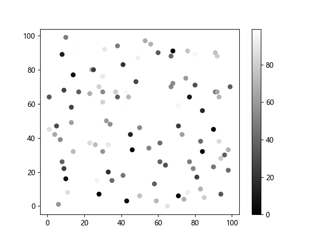 # 这三行代码使编译器能够绘图: import sys import matplotlib matplotlib.use('Agg') import matplotlib.pyplot as plt import numpy as np # 生成随机数据点 x = np.random.randint(100, size=(100)) y = np.random.randint(100, size=(100)) colors = np.random.randint(100, size=(100)) # 使用 gist_yarg_r 配色方案绘制灰度反向渐变色散点图: plt.scatter(x, y, c=colors, cmap='gist_yarg_r') plt.colorbar() plt.show() # 这两行代码使编译器能够输出图形: plt.savefig(sys.stdout.buffer) sys.stdout.flush()