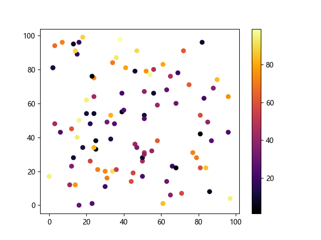 # 这三行代码使编译器能够绘图: import sys import matplotlib matplotlib.use('Agg') import matplotlib.pyplot as plt import numpy as np # 生成随机数据 x = np.random.randint(100, size=(100)) y = np.random.randint(100, size=(100)) colors = np.random.randint(100, size=(100)) # 使用 inferno 配色方案绘制地狱火渐变色散点图: plt.scatter(x, y, c=colors, cmap='inferno') plt.colorbar() plt.show() # 这两行代码使编译器能够输出图形: plt.savefig(sys.stdout.buffer) sys.stdout.flush()