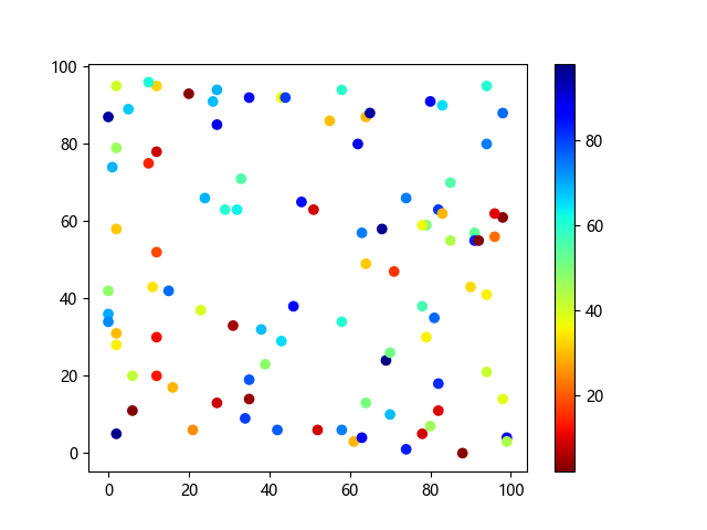 # 这三行代码使编译器能够绘图: import sys import matplotlib matplotlib.use('Agg') import matplotlib.pyplot as plt import numpy as np # 生成随机数据点 x = np.random.randint(100, size=(100)) y = np.random.randint(100, size=(100)) colors = np.random.randint(100, size=(100)) # 使用 jet_r 配色方案绘制 Jet 反向渐变色散点图: plt.scatter(x, y, c=colors, cmap='jet_r') plt.colorbar() plt.show() # 这两行代码使编译器能够输出图形: plt.savefig(sys.stdout.buffer) sys.stdout.flush()
