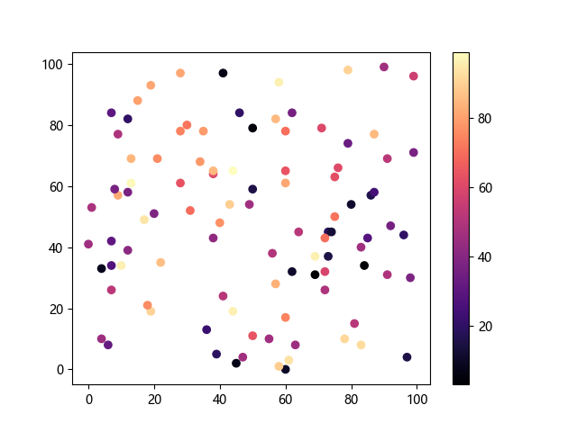 # 这三行代码使编译器能够绘图: import sys import matplotlib matplotlib.use('Agg') import matplotlib.pyplot as plt import numpy as np # 生成随机数据 x = np.random.randint(100, size=(100)) y = np.random.randint(100, size=(100)) colors = np.random.randint(100, size=(100)) # 使用 magma 配色方案绘制岩浆渐变色散点图: plt.scatter(x, y, c=colors, cmap='magma') plt.colorbar() plt.show() # 这两行代码使编译器能够输出图形: plt.savefig(sys.stdout.buffer) sys.stdout.flush()
