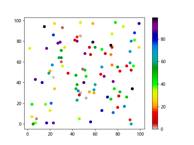 #Three lines to make our compiler able to draw: import sys import matplotlib matplotlib.use('Agg') import matplotlib.pyplot as plt import numpy as np x = np.random.randint(100, size=(100)) y = np.random.randint(100, size=(100)) colors = np.random.randint(100, size=(100)) plt.scatter(x, y, c=colors, cmap='nipy_spectral_r') plt.colorbar() plt.show() #Two lines to make our compiler able to draw: plt.savefig(sys.stdout.buffer) sys.stdout.flush()