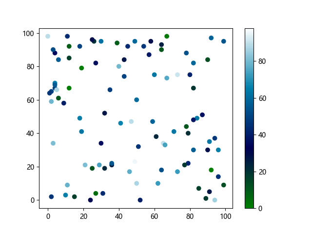 # 这三行代码使编译器能够绘图: import sys import matplotlib matplotlib.use('Agg') import matplotlib.pyplot as plt import numpy as np # 生成随机数据 x = np.random.randint(100, size=(100)) y = np.random.randint(100, size=(100)) colors = np.random.randint(100, size=(100)) # 使用 ocean 配色方案绘制海洋渐变色散点图: plt.scatter(x, y, c=colors, cmap='ocean') plt.colorbar() plt.show() # 这两行代码使编译器能够输出图形: plt.savefig(sys.stdout.buffer) sys.stdout.flush()