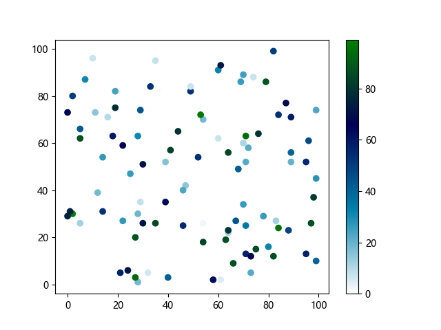 # 这三行代码使编译器能够绘图: import sys import matplotlib matplotlib.use('Agg') import matplotlib.pyplot as plt import numpy as np # 生成随机数据点 x = np.random.randint(100, size=(100)) y = np.random.randint(100, size=(100)) colors = np.random.randint(100, size=(100)) # 使用 ocean_r 配色方案绘制海洋色反向渐变色散点图: plt.scatter(x, y, c=colors, cmap='ocean_r') plt.colorbar() plt.show() # 这两行代码使编译器能够输出图形: plt.savefig(sys.stdout.buffer) sys.stdout.flush()