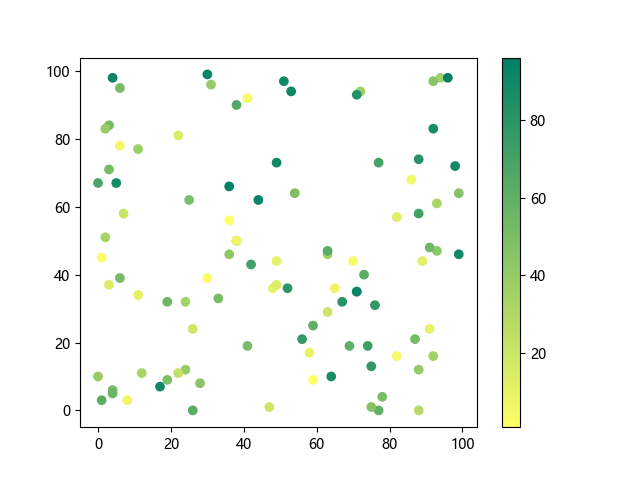 # 以下三行代码使编译器支持绘图功能: import sys import matplotlib matplotlib.use('Agg') import matplotlib.pyplot as plt import numpy as np # 生成随机数据: x = np.random.randint(100, size=(100)) y = np.random.randint(100, size=(100)) colors = np.random.randint(100, size=(100)) # 使用 summer 反向配色方案创建散点图: plt.scatter(x, y, c=colors, cmap='summer_r') plt.colorbar() plt.show() # 以下两行代码使编译器能够输出图形: plt.savefig(sys.stdout.buffer) sys.stdout.flush()