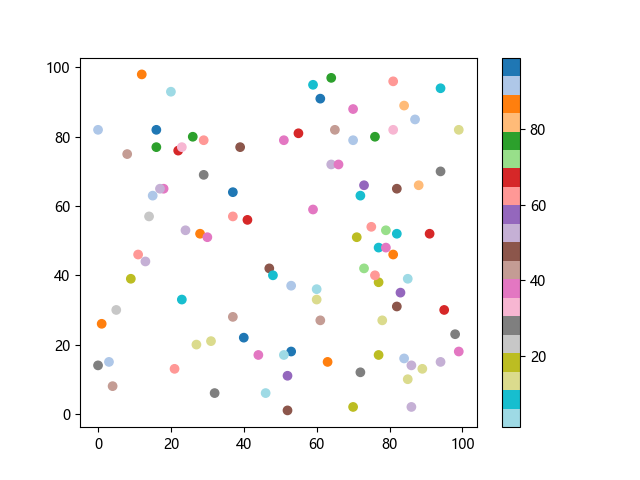 # 以下三行代码使编译器支持绘图功能: import sys import matplotlib matplotlib.use('Agg') import matplotlib.pyplot as plt import numpy as np # 生成随机数据: x = np.random.randint(100, size=(100)) y = np.random.randint(100, size=(100)) colors = np.random.randint(100, size=(100)) # 使用 tab20 反向离散配色方案创建散点图: plt.scatter(x, y, c=colors, cmap='tab20_r') plt.colorbar() plt.show() # 以下两行代码使编译器能够输出图形: plt.savefig(sys.stdout.buffer) sys.stdout.flush()