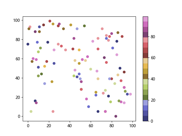 # 以下三行代码使编译器支持绘图功能: import sys import matplotlib matplotlib.use('Agg') import matplotlib.pyplot as plt import numpy as np # 生成随机数据: x = np.random.randint(100, size=(100)) y = np.random.randint(100, size=(100)) colors = np.random.randint(100, size=(100)) # 使用 tab20b 离散配色方案创建散点图: plt.scatter(x, y, c=colors, cmap='tab20b') plt.colorbar() plt.show() # 以下两行代码使编译器能够输出图形: plt.savefig(sys.stdout.buffer) sys.stdout.flush()