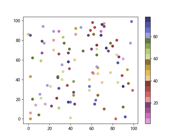 # 以下三行代码使编译器支持绘图功能: import sys import matplotlib matplotlib.use('Agg') import matplotlib.pyplot as plt import numpy as np # 生成随机数据: x = np.random.randint(100, size=(100)) y = np.random.randint(100, size=(100)) colors = np.random.randint(100, size=(100)) # 使用 tab20b 反向离散配色方案创建散点图: plt.scatter(x, y, c=colors, cmap='tab20b_r') plt.colorbar() plt.show() # 以下两行代码使编译器能够输出图形: plt.savefig(sys.stdout.buffer) sys.stdout.flush()
