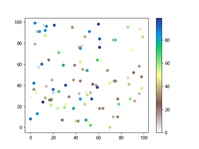 # 以下三行代码使编译器支持绘图功能: import sys import matplotlib matplotlib.use('Agg') import matplotlib.pyplot as plt import numpy as np # 生成随机数据: x = np.random.randint(100, size=(100)) y = np.random.randint(100, size=(100)) colors = np.random.randint(100, size=(100)) # 使用地形反向 (terrain_r) 配色方案创建散点图: plt.scatter(x, y, c=colors, cmap='terrain_r') plt.colorbar() plt.show() # 以下两行代码使编译器能够输出图形: plt.savefig(sys.stdout.buffer) sys.stdout.flush()