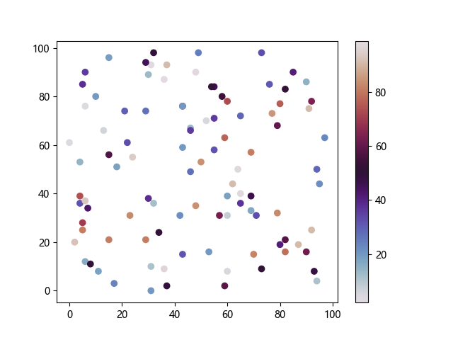 # 以下三行代码使编译器支持绘图功能: import sys import matplotlib matplotlib.use('Agg') import matplotlib.pyplot as plt import numpy as np # 生成随机数据: x = np.random.randint(100, size=(100)) y = np.random.randint(100, size=(100)) colors = np.random.randint(100, size=(100)) # 使用 twilight 配色方案创建散点图: plt.scatter(x, y, c=colors, cmap='twilight') plt.colorbar() plt.show() # 以下两行代码使编译器能够输出图形: plt.savefig(sys.stdout.buffer) sys.stdout.flush()