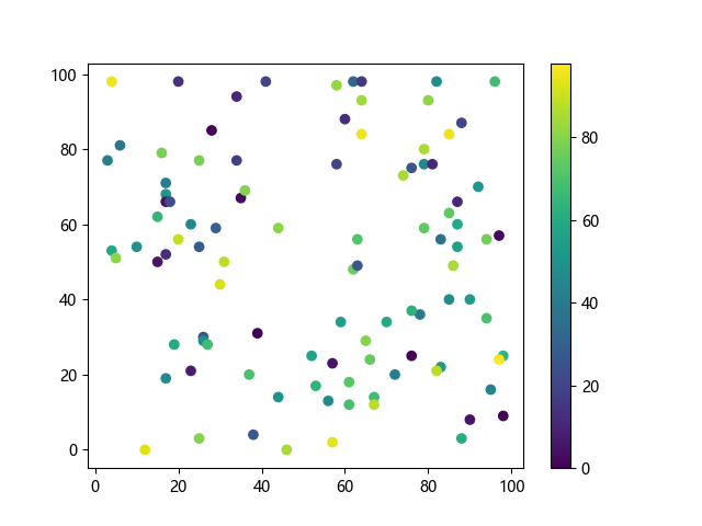 # 以下三行代码使编译器支持绘图功能: import sys import matplotlib matplotlib.use('Agg') import matplotlib.pyplot as plt import numpy as np # 生成随机数据: x = np.random.randint(100, size=(100)) y = np.random.randint(100, size=(100)) colors = np.random.randint(100, size=(100)) # 使用 viridis 配色方案创建散点图: plt.scatter(x, y, c=colors, cmap='viridis') plt.colorbar() plt.show() # 以下两行代码使编译器能够输出图形: plt.savefig(sys.stdout.buffer) sys.stdout.flush()